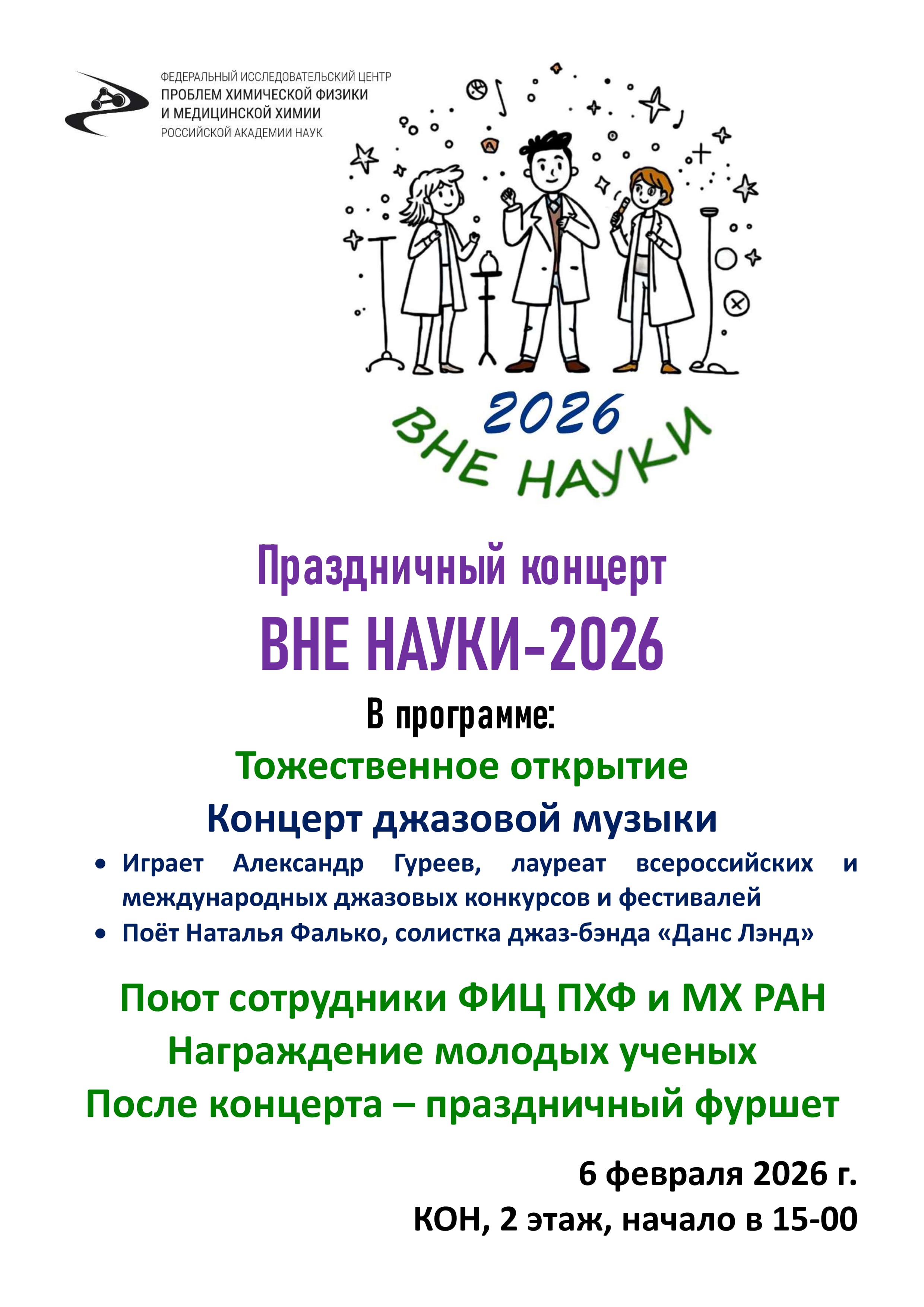 - Тожественное открытие - Концерт джазовой музыки: Играет Александр Гуреев, лауреат всероссийских и международных джазовых конкурсов и фестивалей Поёт Наталья Фалько, солистка джаз-бэнда «Данс Лэнд» - Поют сотрудники ФИЦ ПХФ и МХ РАН - Награждение молодых ученых - После концерта – праздничный фуршет.
