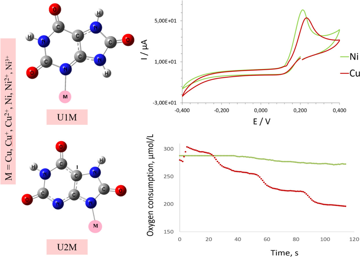 Ключ к разгадке этого контраста кроется во взаимодействии наночастиц с молекулярным кислородом. Используя мини-сенсор кислорода, учёные установили, что поверхность Cu-NPs активно потребляет кислород, что провоцирует параллельные конкурирующие реакции и снижает селективность. Поверхность же Ni-NPs в щелочной среде оказалась инертной к кислороду, что исключило побочные процессы. Квантово-химические расчёты дополнительно показали, что комплексы мочевой кислоты с ионами никеля характеризуются более высокой поляризуемостью, что облегчает именно её селективное окисление.