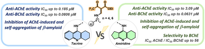 Синтезированы новые конъюгаты такрина и амиридина с производными трифторацетоуксусных эфиров. Все конъюгаты являются эффективными ингибиторами холинэстеразы. Активность лидеров превышает активность родительских фармакофоров. Конъюгаты амиридина характеризуются более высокой селективностью в отношении бутирилхолинэстеразы. Конъюгаты вытесняют пропидий из периферического анионного сайта ацетилхолинэстеразы на уровне и выше уровня донепезила и способны блокировать самоагрегацию β-амилоида