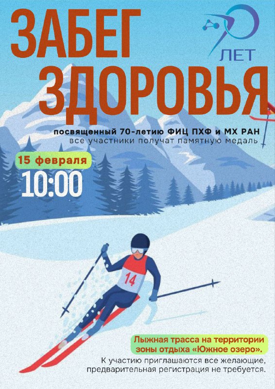 Друзья, 15 февраля нас ждет не просто спортивный праздник, а настоящее историческое событие! В рамках традиционной «Черноголовской лыжни» состоится специальный «Забег здоровья», посвященный большому юбилею — 70-летию ФИЦ ПХФ и МХ РАН!