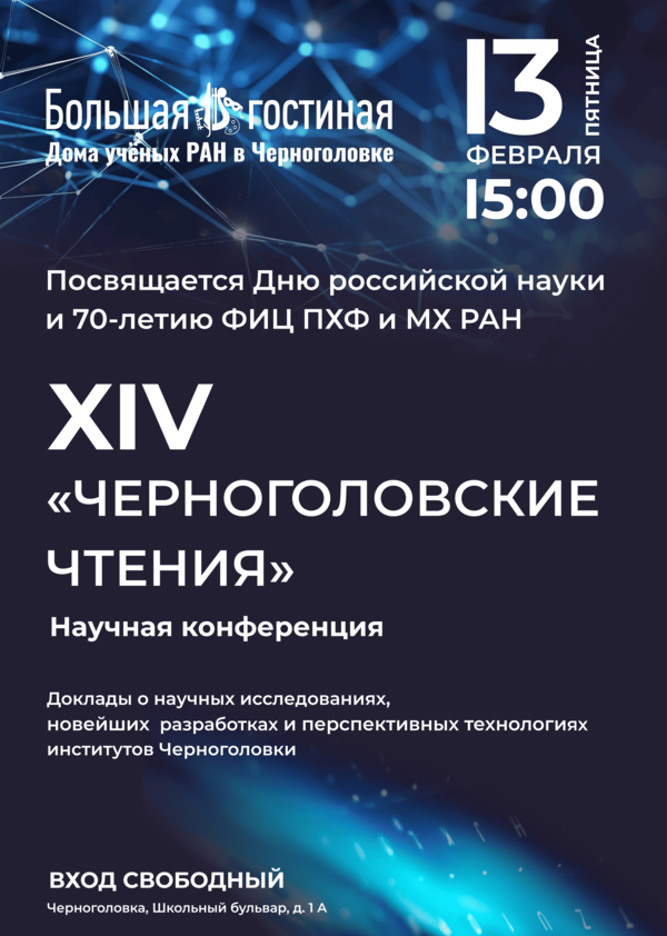 13 февраля с 15.00 до 18.00 в Большой гостиной Дома ученых РАН в Черноголовке пройдет XIV научная конференция «Черноголовские чтения».